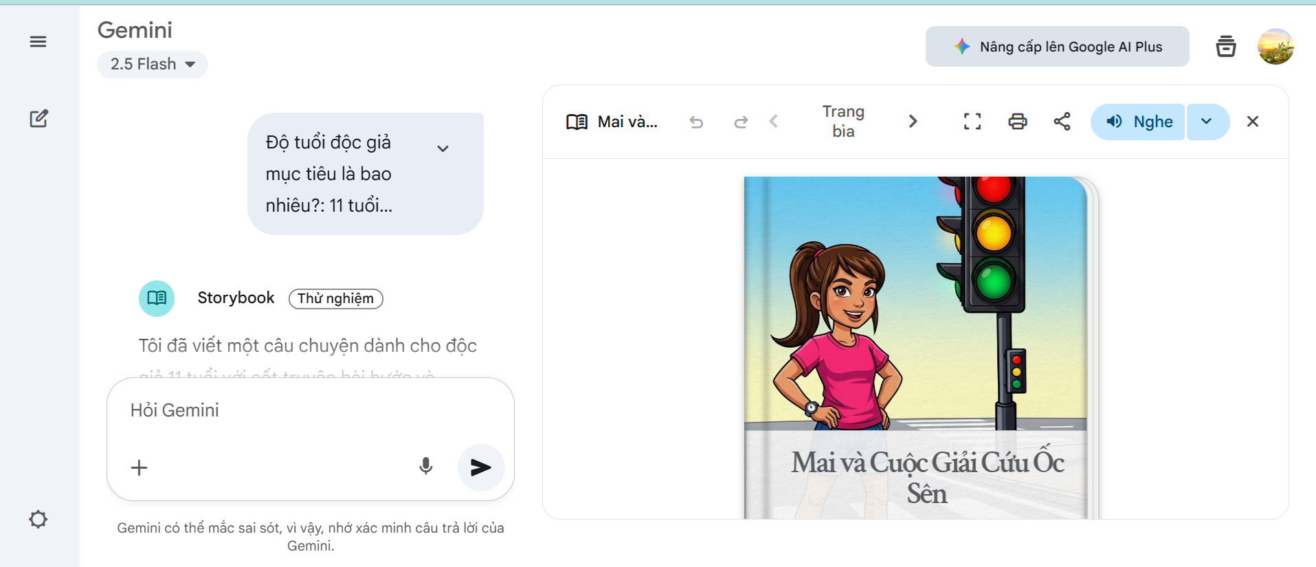 • Lệnh để Gemini tạo giọng đọc / âm thanh phù hợp cho nội dung — “sách lật có âm thanh” Họa Tiểu
